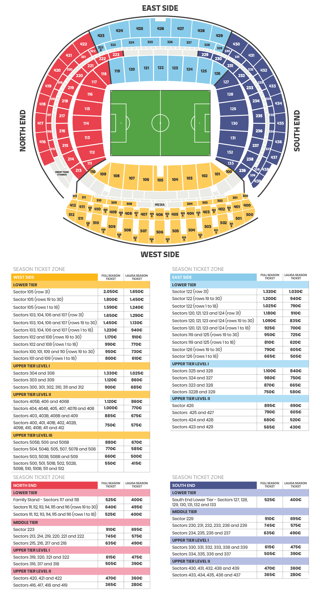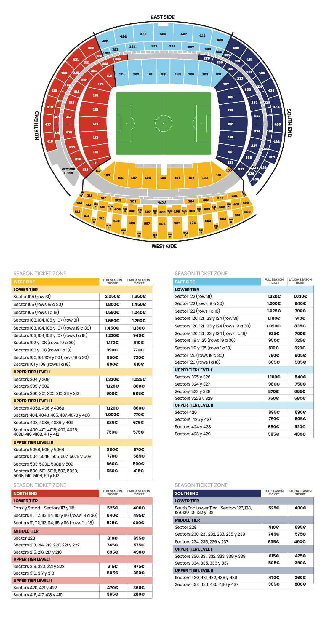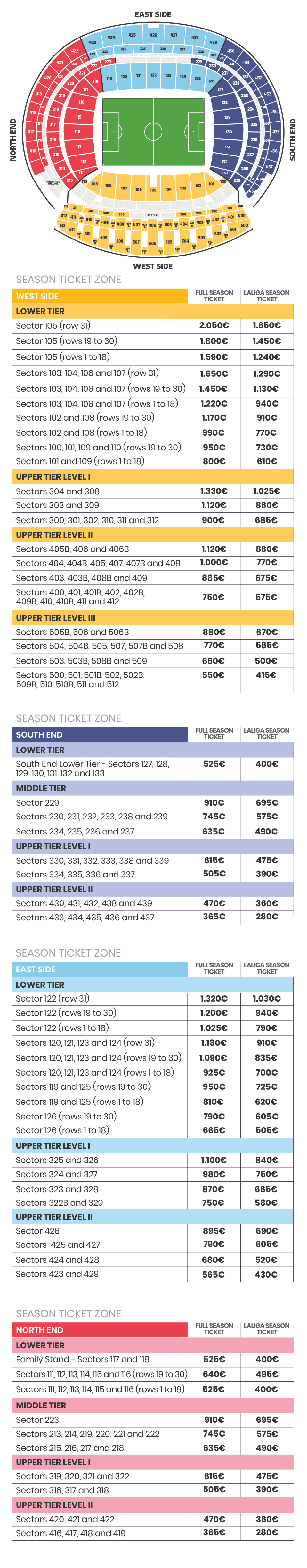 - South End Lower Stand : only young people between 14 and 24 years old are eligible for this season ticket (that is, born between 01/06/2000 and 31/05/2011). The prices are 210€ for LaLiga League Ticket and 270€ for the Full Season Ticket.